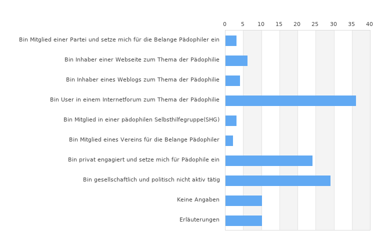 | Bin Mitglied einer Partei und setze mich für die Belange Pädophiler ein | 3 | |||||||||||||||||||||