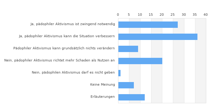 | Ja, pädophiler Aktivismus kann die Situation verbessern | 36 | |||||||||||||||||||||||||